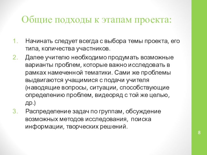Далее учителю необходимо продумать возможные варианты проблем, которые важно исследовать в рамках намеченной тематики. Сами же проблемы выдвигаются учащимися с подачи учителя (наводящие вопросы, ситуации, способствующие определению проблем, видеоряд с той же целью, др.)