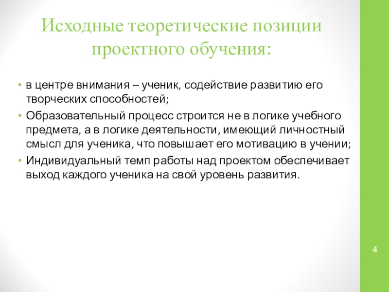Слайд 4Исходные теоретические позиции проектного обучения: