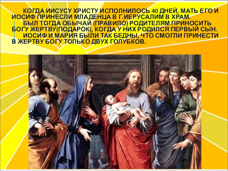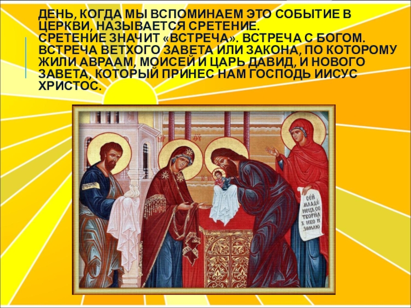 Слайд 7ДЕНЬ, КОГДА МЫ ВСПОМИНАЕМ ЭТО СОБЫТИЕ В ЦЕРКВИ, НАЗЫВАЕТСЯ СРЕТЕНИЕ.