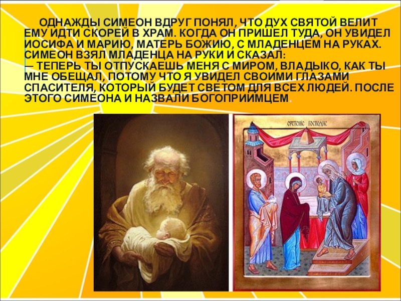— ТЕПЕРЬ ТЫ ОТПУСКАЕШЬ МЕНЯ С МИРОМ, ВЛАДЫКО, КАК ТЫ МНЕ ОБЕЩАЛ, ПОТОМУ ЧТО Я УВИДЕЛ СВОИМИ ГЛАЗАМИ СПАСИТЕЛЯ, КОТОРЫЙ БУДЕТ СВЕТОМ ДЛЯ ВСЕХ ЛЮДЕЙ. ПОСЛЕ ЭТОГО СИМЕОНА И НАЗВАЛИ БОГОПРИИМЦЕМ.