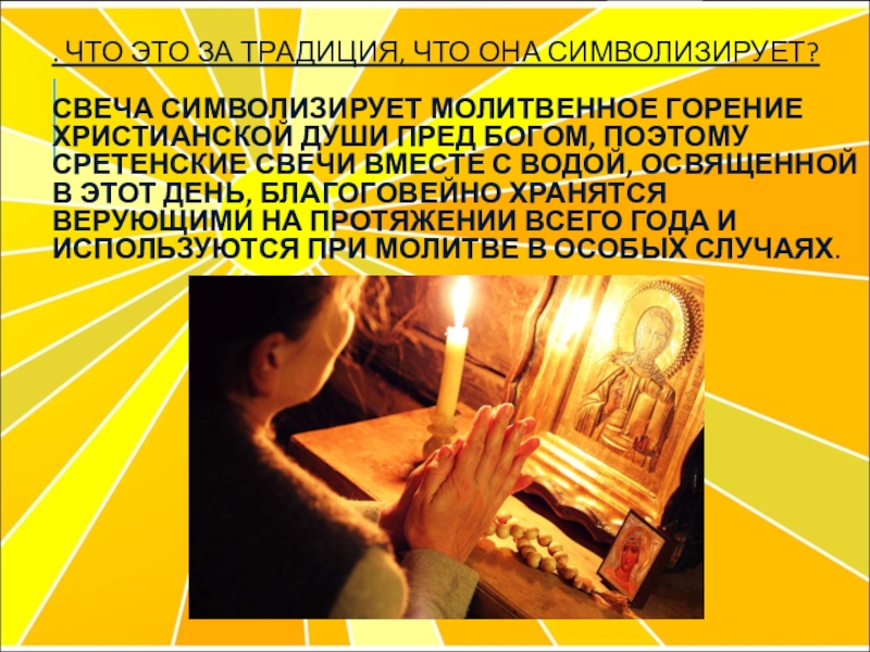 ХРИСТИАНСКОЙ ДУШИ ПРЕД БОГОМ, ПОЭТОМУ СРЕТЕНСКИЕ СВЕЧИ ВМЕСТЕ С ВОДОЙ, ОСВЯЩЕННОЙ В ЭТОТ ДЕНЬ, БЛАГОГОВЕЙНО ХРАНЯТСЯ ВЕРУЮЩИМИ НА ПРОТЯЖЕНИИ ВСЕГО ГОДА И ИСПОЛЬЗУЮТСЯ ПРИ МОЛИТВЕ В ОСОБЫХ СЛУЧАЯХ.