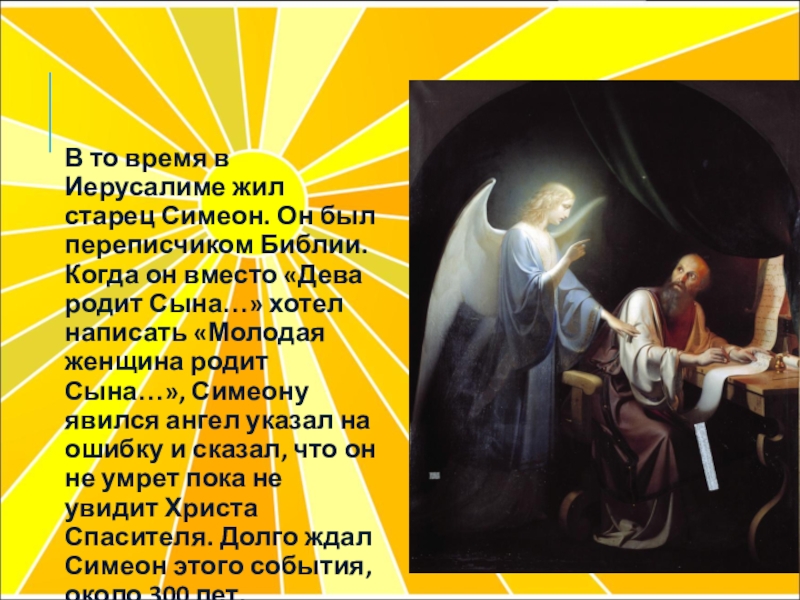 Библии. Когда он вместо «Дева родит Сына…» хотел написать «Молодая женщина родит Сына…», Симеону явился ангел указал на ошибку и сказал, что он не умрет пока не увидит Христа Спасителя. Долго ждал Симеон этого события, около 300 лет.