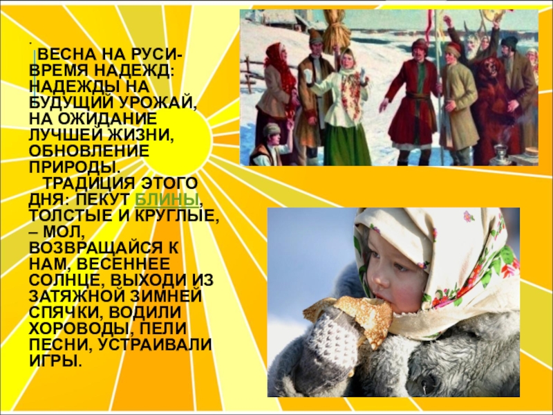 ТРАДИЦИЯ ЭТОГО ДНЯ: ПЕКУТ БЛИНЫ, ТОЛСТЫЕ И КРУГЛЫЕ, – МОЛ, ВОЗВРАЩАЙСЯ К НАМ, ВЕСЕННЕЕ СОЛНЦЕ, ВЫХОДИ ИЗ ЗАТЯЖНОЙ ЗИМНЕЙ СПЯЧКИ, ВОДИЛИ ХОРОВОДЫ, ПЕЛИ ПЕСНИ, УСТРАИВАЛИ ИГРЫ.