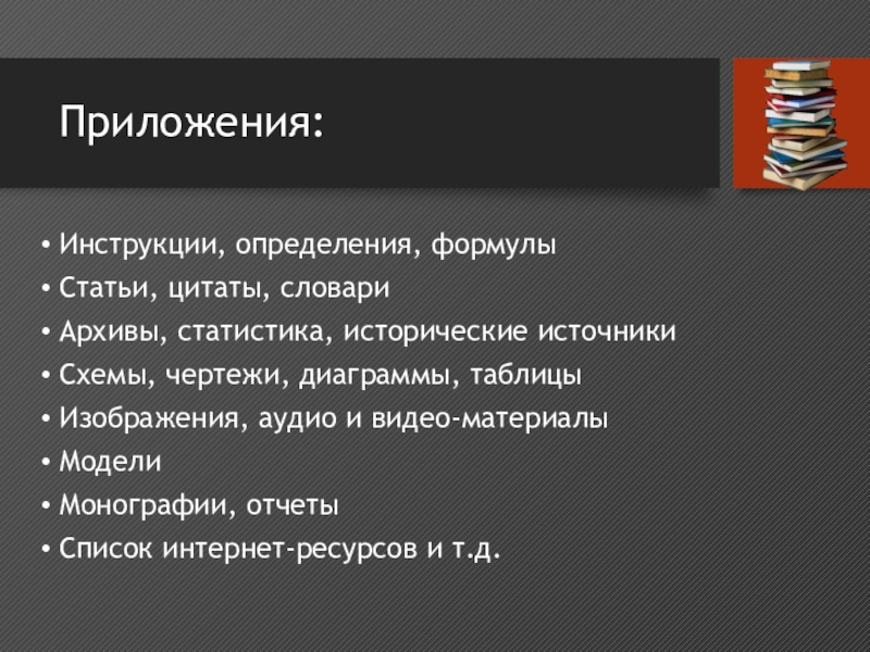 Приложения:Инструкции, определения, формулыСтатьи, цитаты, словариАрхивы, статистика, исторические источникиСхемы, чертежи, диаграммы, таблицыИзображения, аудио и видео-материалыМодели Монографии, отчетыСписок интернет-ресурсов