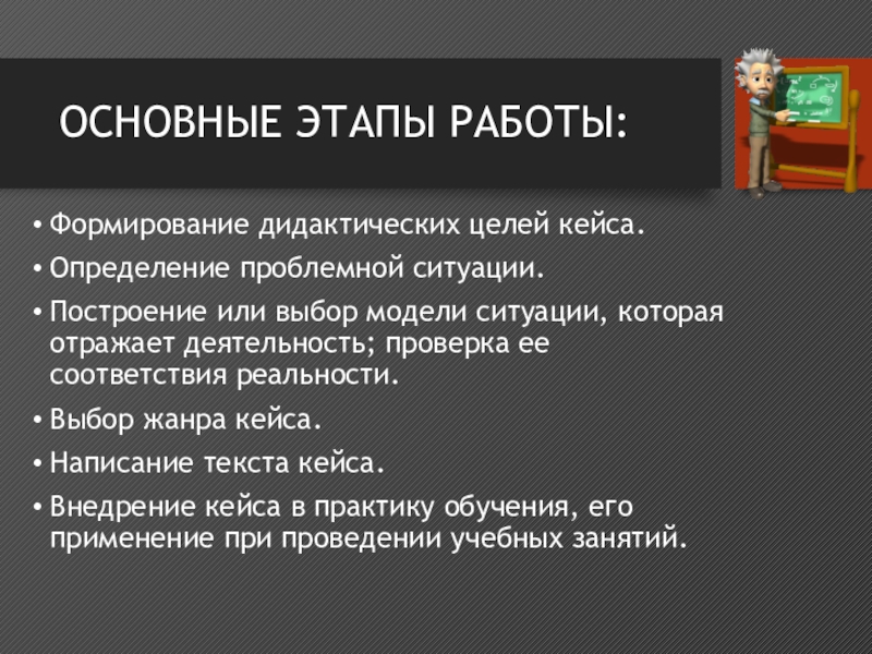 ОСНОВНЫЕ ЭТАПЫ РАБОТЫ:Формирование дидактических целей кейса. Определение проблемной ситуации.Построение или выбор модели ситуации, которая отражает деятельность; проверка