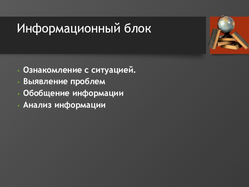 Информационный блок Ознакомление с ситуацией.Выявление проблемОбобщение информацииАнализ информации