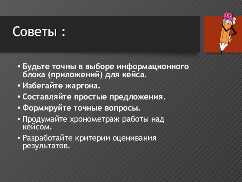 Советы : Будьте точны в выборе информационного блока (приложений) для кейса. Избегайте жаргона. Составляйте простые предложения.Формируйте точные