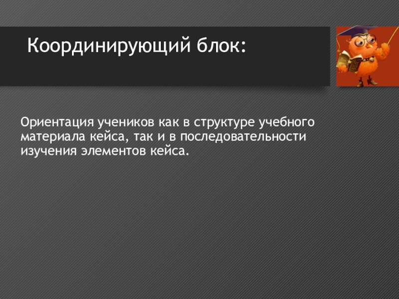 Координирующий блок: Ориентация учеников как в структуре учебного материала кейса, так и в последовательности изучения элементов кейса.
