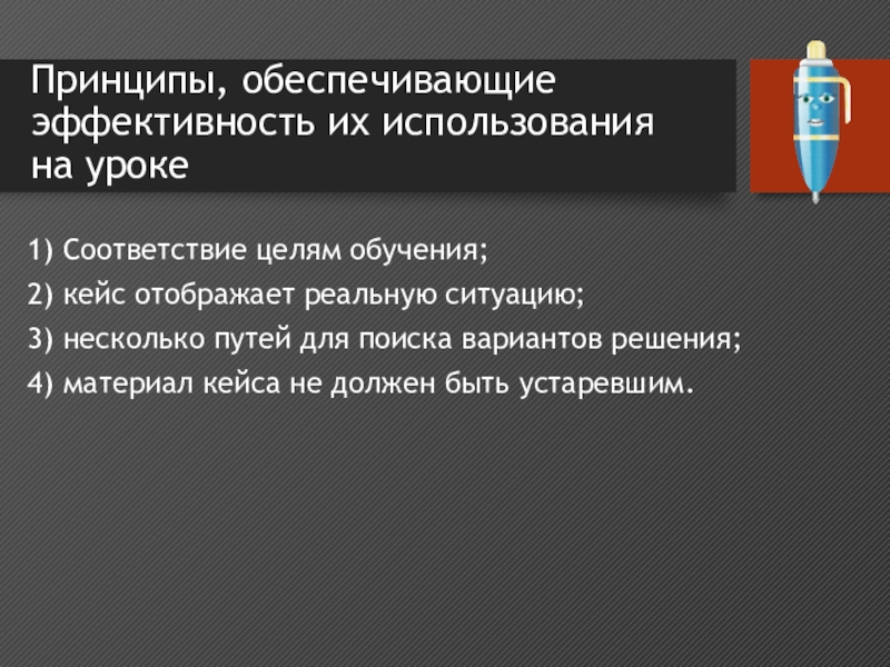 Принципы, обеспечивающие  эффективность их использования  на уроке1) Соответствие целям обучения;2) кейс отображает реальную ситуацию;3) несколько