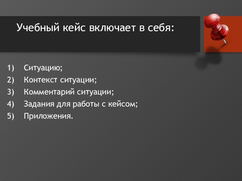 Учебный кейс включает в себя:  Ситуацию;Контекст ситуации; Комментарий ситуации;Задания для работы с кейсом;Приложения.