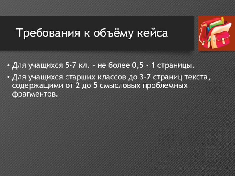 Требования к объёму кейсаДля учащихся 5-7 кл. – не более 0,5 - 1 страницы. Для учащихся старших