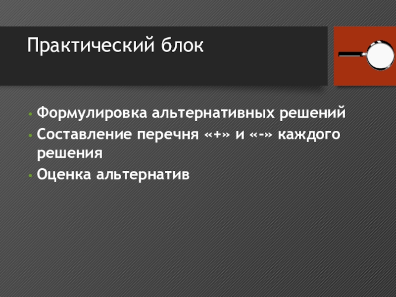 Практический блок  Формулировка альтернативных решенийСоставление перечня «+» и «-» каждого решенияОценка альтернатив