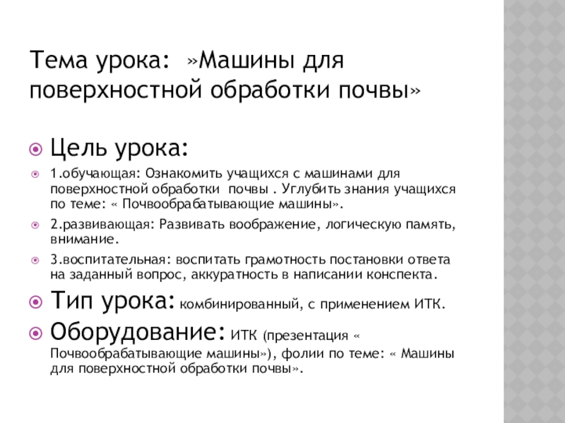 Слайд 4Тема урока: »Машины для поверхностной обработки почвы»