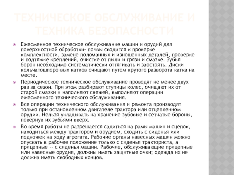 Все операции технического обслуживания и ремонта производят только при остановленном двигателе трактора или отцепленном орудии. Нельзя укладывать на хранение зубовые и сетчатые бороны, повернув их зубьями вверх.