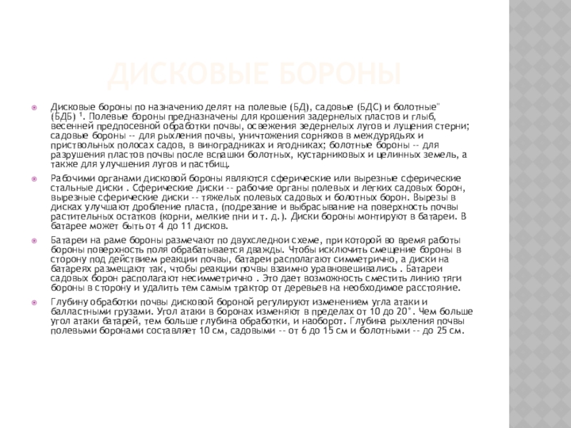 Дисковые бороны по назначению делят на полевые (БД), садовые (БДС)