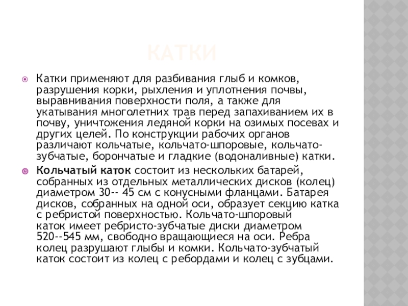 уплотнения почвы, выравнивания поверхности поля, а также для укатывания многолетних трав перед запахиванием их в почву, уничтожения ледяной корки на озимых посевах и других целей. По конструкции рабочих органов различают кольчатые, кольчато-шпоровые, кольчато-зубчатые, борончатые и гладкие (водоналивные) катки.