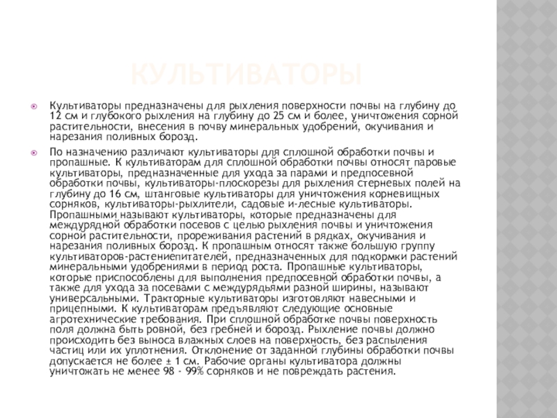 По назначению различают культиваторы для сплошной обработки почвы и пропашные. К культиваторам для сплошной обработки почвы относят паровые культиваторы, предназначенные для ухода за парами и предпосевной обработки почвы, культиваторы-плоскорезы для рыхления стерневых полей на глубину до 16 см, штанговые культиваторы для уничтожения корневищных сорняков, культиваторы-рыхлители, садовые и-лесные культиваторы. Пропашными называют культиваторы, которые предназначены для междурядной обработки посевов с целью рыхления почвы и уничтожения сорной растительности, прореживания растений в рядках, окучивания и нарезания поливных борозд. К пропашным относят также большую группу культиваторов-растениепитателей, предназначенных для подкормки растений минеральными удобрениями в период роста. Пропашные культиваторы, которые приспособлены для выполнения предпосевной обработки почвы, а также для ухода за посевами с междурядьями разной ширины, называют универсальными. Тракторные культиваторы изготовляют навесными и прицепными. К культиваторам предъявляют следующие основные агротехнические требования. При сплошной обработке почвы поверхность поля должна быть ровной, без гребней и борозд. Рыхление почвы должно происходить без выноса влажных слоев на поверхность, без распыления частиц или их уплотнения. Отклонение от заданной глубины обработки почвы допускается не более ± 1 см. Рабочие органы культиватора должны уничтожать не менее 98 - 99% сорняков и не повреждать растения.