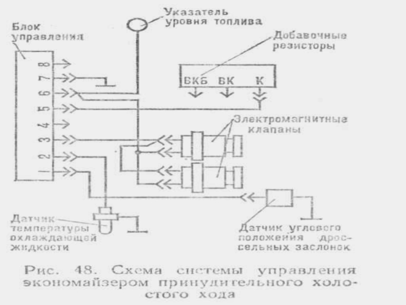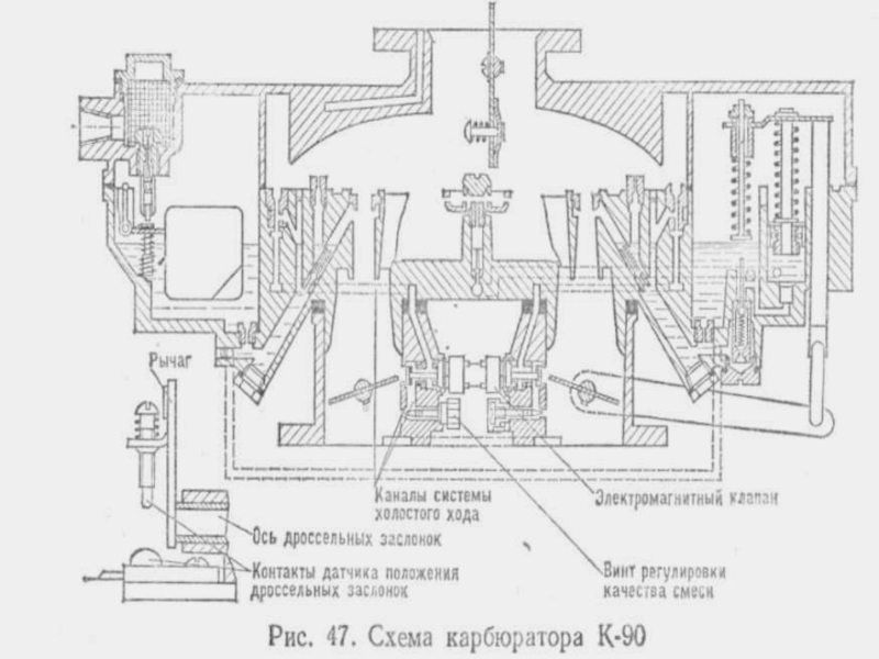установленного в кабине за щитком приборов, датчиков частоты вращения коленчатого вала, температуры охлаждающей жидкости, углового положения дроссельных заслонок и двух электромагнитных клапанов, встроенных в каналы системы холостого хода карбюратора К-90.