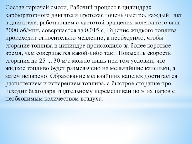 Слайд 9Состав горючей смеси. Рабочий процесс в цилиндрах карбюраторного двигателя протекает очень