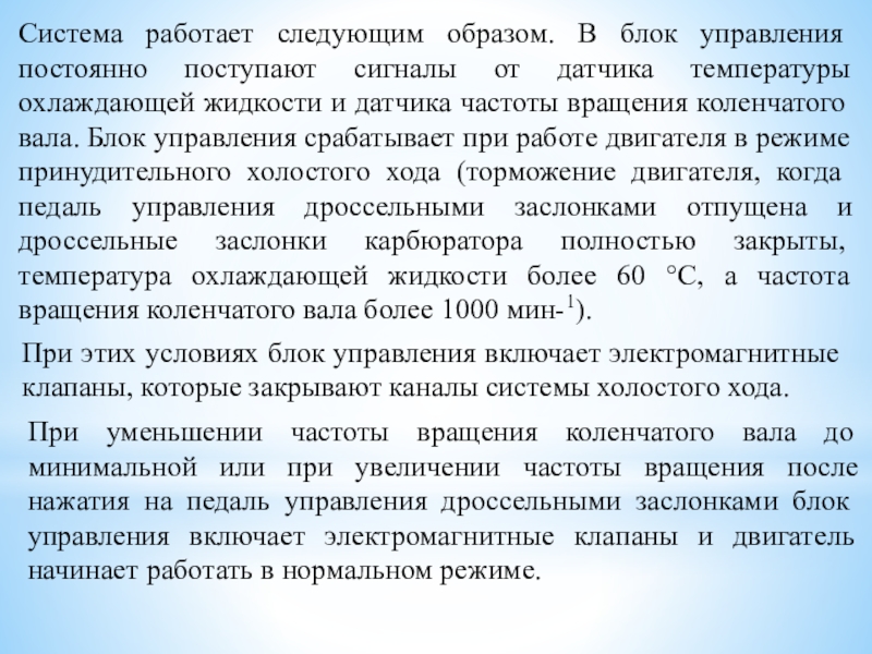 При этих условиях блок управления включает электромагнитные клапаны, которые закрывают каналы системы холостого хода.