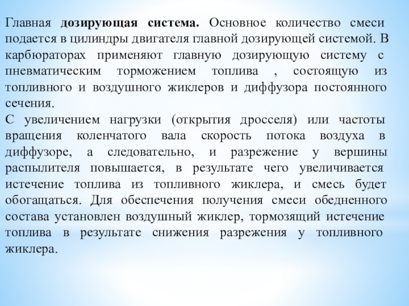 Слайд 21Главная дозирующая система. Основное количество смеси подается в цилиндры двигателя главной