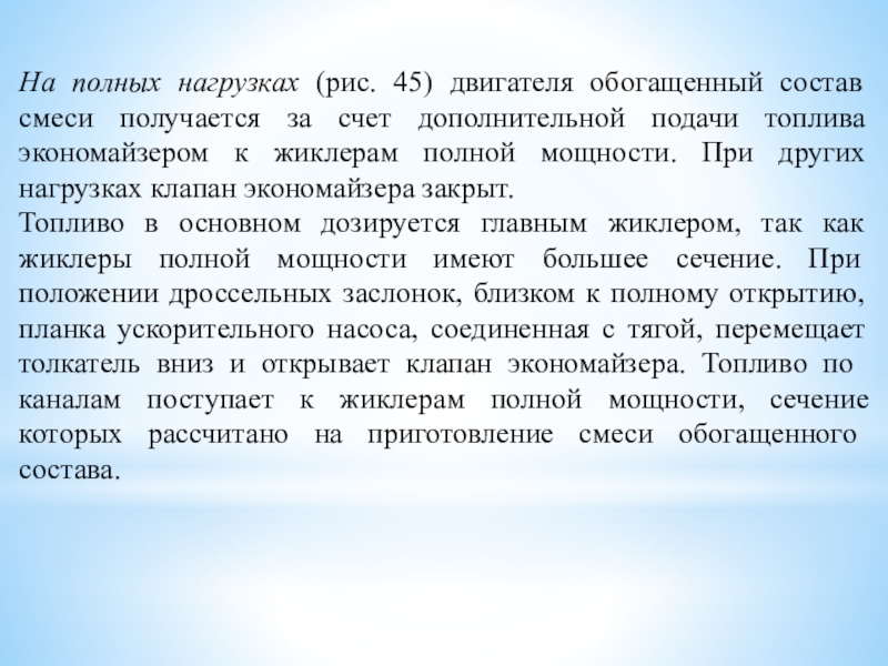 Слайд 45На полных нагрузках (рис. 45) двигателя обогащенный состав смеси получается за