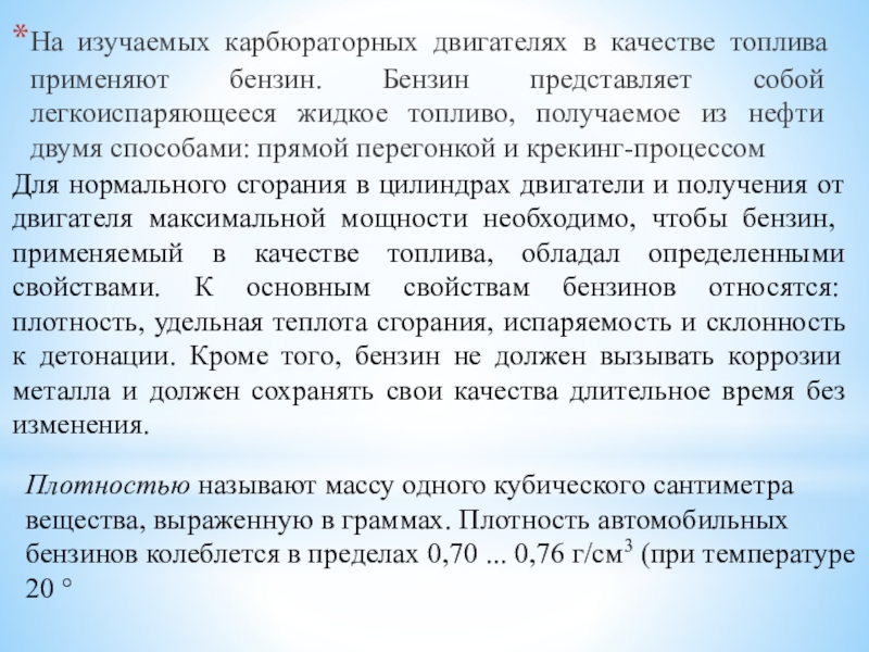 Для нормального сгорания в цилиндрах двигатели и получения от двигателя максимальной мощности необходимо, чтобы бензин, применяемый в качестве топлива, обладал определенными свойствами. К основным свойствам бензинов относятся: плотность, удельная теплота сгорания, испаряемость и склонность к детонации. Кроме того, бензин не должен вызывать коррозии металла и должен сохранять свои качества длительное время без изменения.