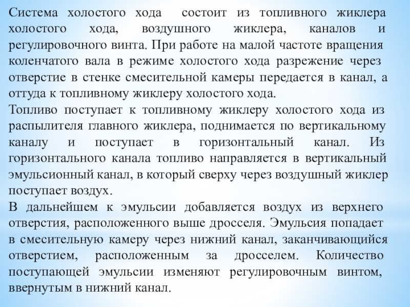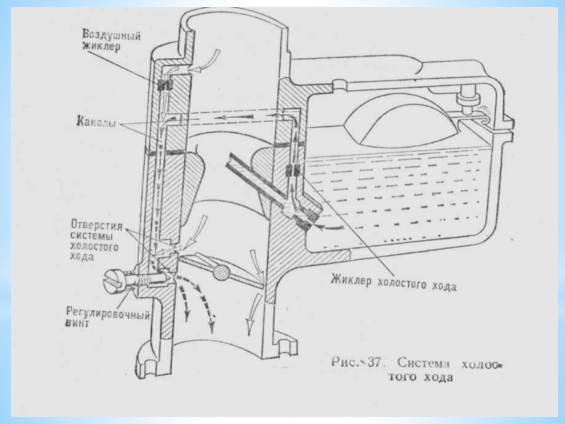 Слайд 24Система холостого хода состоит из топливного жиклера холостого хода, воздушного жиклера,