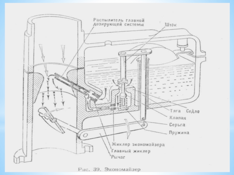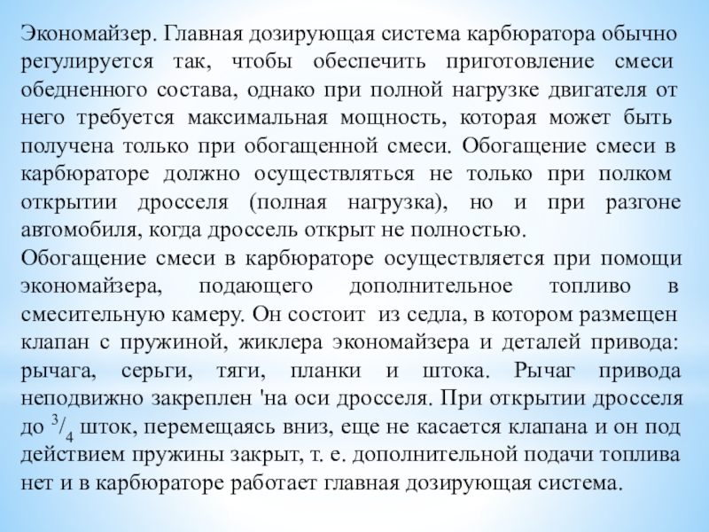 Слайд 31Экономайзер. Главная дозирующая система карбюратора обычно регулируется так, чтобы обеспечить приготовление
