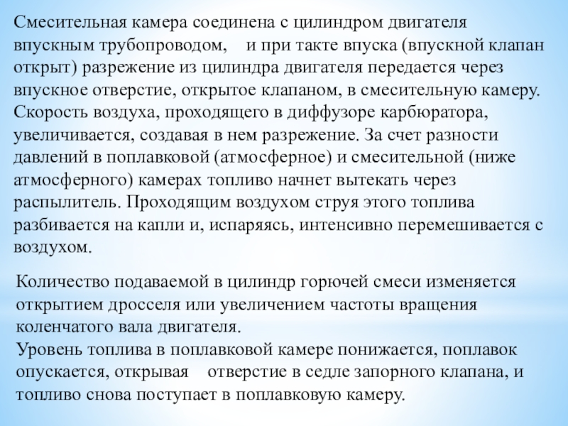 Слайд 17Смесительная камера соединена с цилиндром двигателя впускным трубопроводом, и при такте