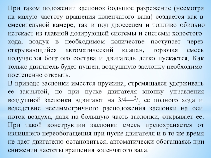холодного двигателя может быть обеспечен только при богатой горючей смеси. Приготовление такой смеси обеспечивается прикрытием воздушной заслонки; дроссельные заслонки в это время будут приоткрыты.