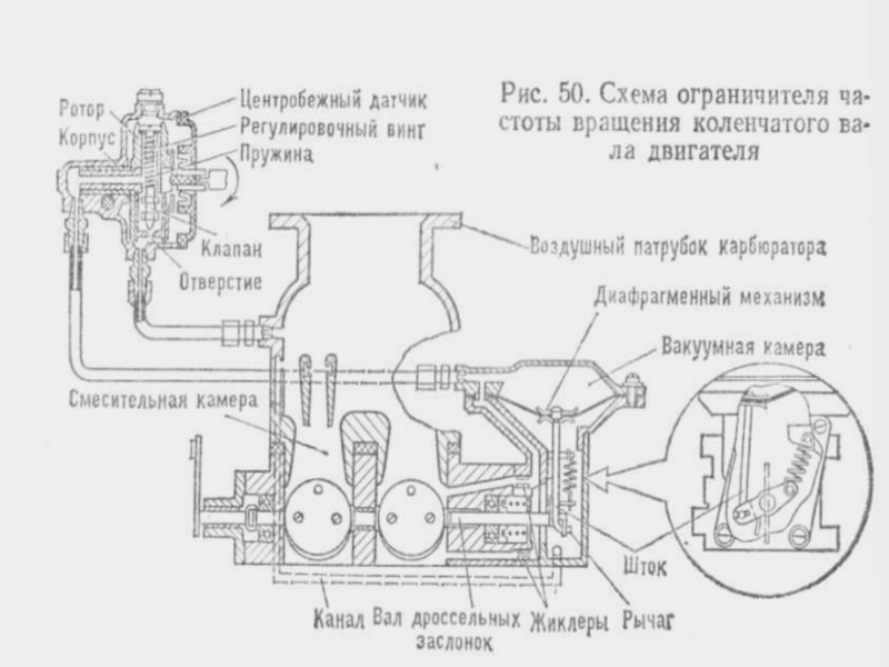 Для ограничения частоты вращения коленчатого вала служит ограничитель (рис. 50), который состоит из центробежного датчика (расположенного на крышке распределительных шестерен двигателя), приводимого в действие от распределительного вала, и диафрагменного исполнительного механизма, конструктивно объединенного со смесительной камерой карбюратора и воздействующего на дроссельные заслонки. При частоте вращения коленчатого вала двигателя ниже максимальной клапан датчика открыт. Полость вакуумной камеры над диафрагмой через открытый клапан соединена с воздушным патрубком карбюратора, а полость под диафрагмой соединена со смесительной камерой. Создаваемое при этом разрежение под диафрагмой имеет небольшое значение и вал дроссельных заслонок свободно поворачивается в сторону открытия под действием пружины.