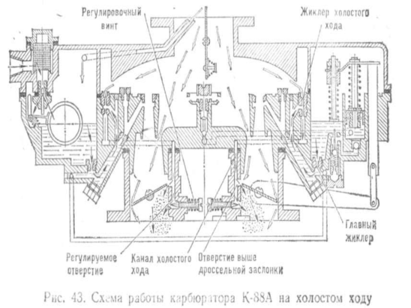через отверстия в стенках смесительных камер в каналы системы холостого хода. Через главные жиклеры топливо из поплавковой камеры поступает к жиклерам холостого хода. По пути к топливу через воздушные жиклеры, а затем через отверстия над дроссельными заслонками подмешивается воздух. Полученная эмульсия поступает через регулируемые отверстия под дроссельные заслонки, где смешиваясь с основным потоком воздуха, образует обогащенную смесь