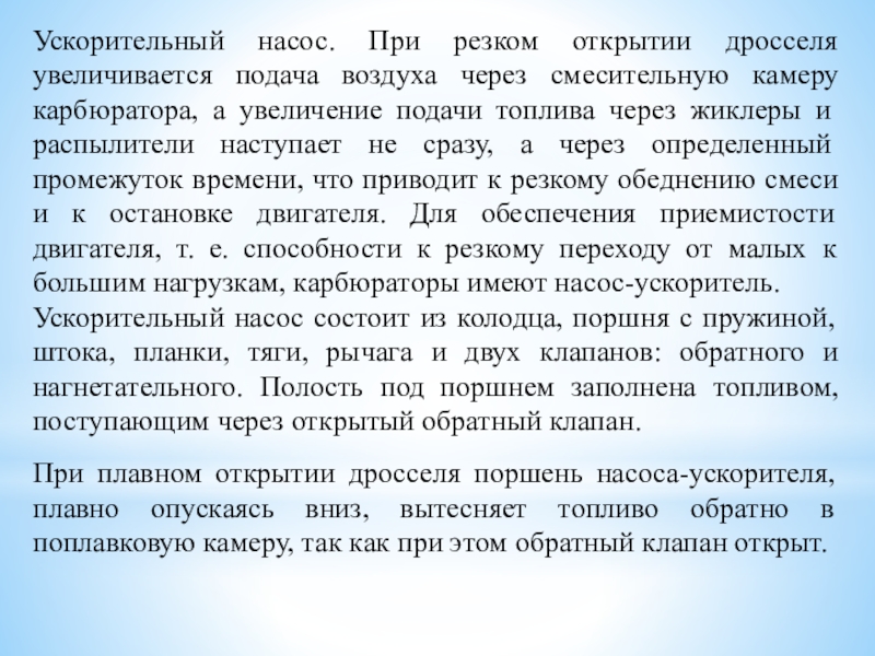Слайд 34Ускорительный насос. При резком открытии дросселя увеличивается подача воздуха через смесительную