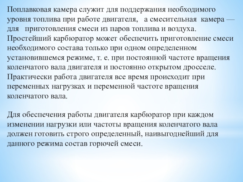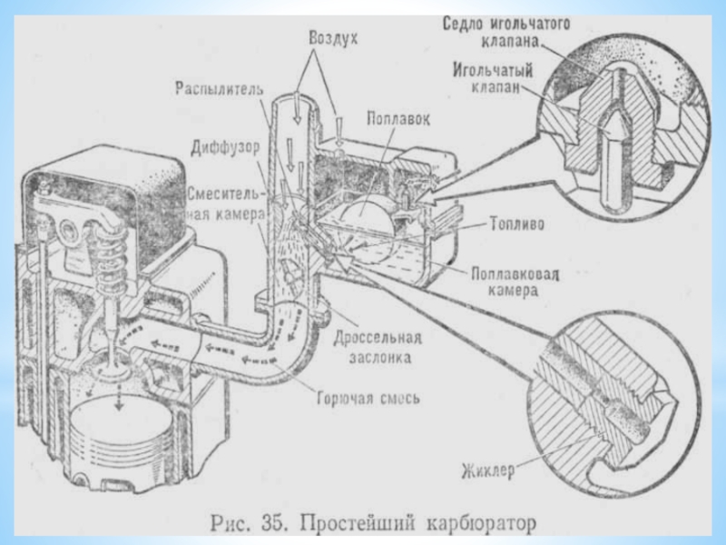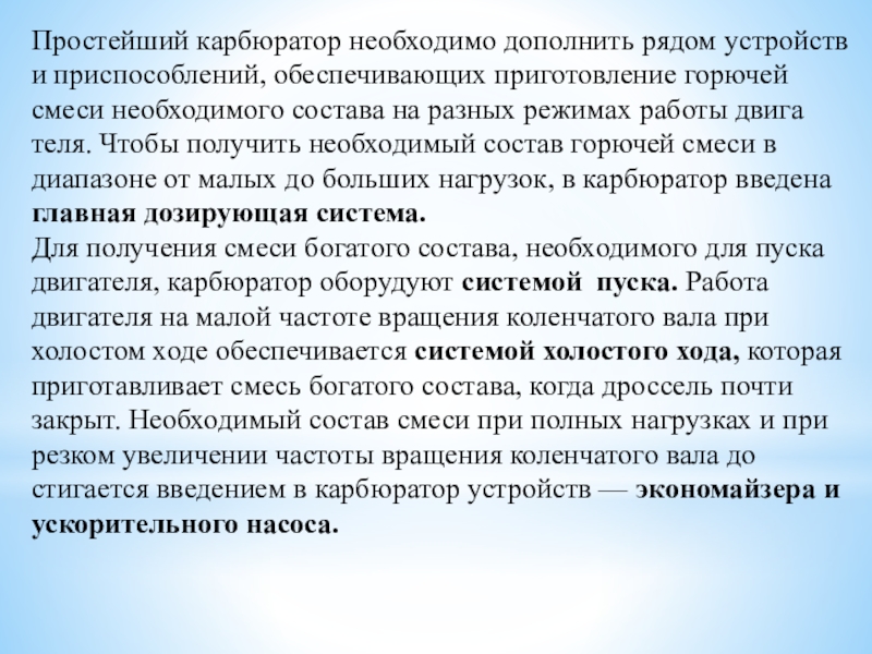 Слайд 19Простейший карбюратор необходимо дополнить рядом устройств и приспособлений, обеспечивающих приготовление горючей