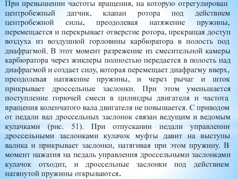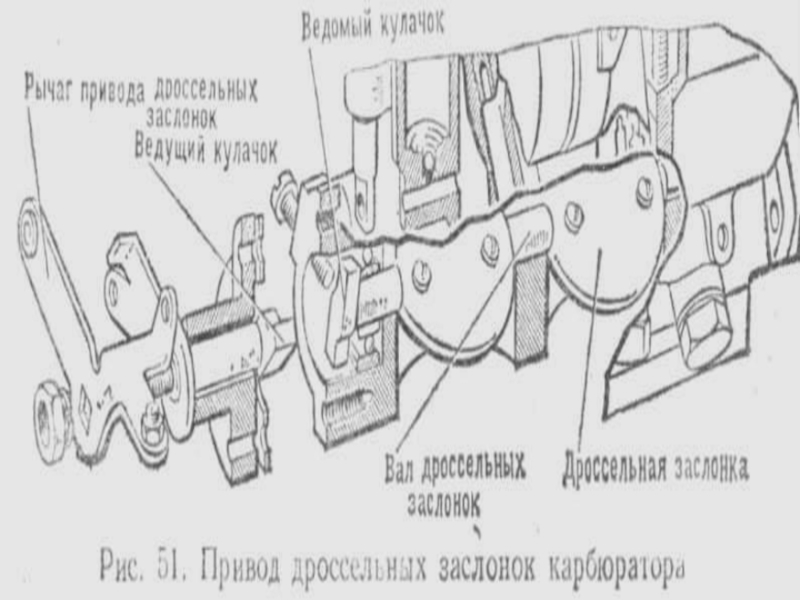 под действием центробежной силы, преодолевая натяжение пружины, перемещается и перекрывает отверстие ротора, прекращая доступ воздуха из воздушной горловины карбюратора в полость под диафрагмой. В этот момент разрежение из смесительной камеры карбюратора через жиклеры полностью передается в полость над диафрагмой и создает силу, которая перемещает диафрагму вверх, преодолевая натяжение пружины, и через рычаг и шток прикрывает дроссельные заслонки. При этом уменьшается поступление горючей смеси в цилиндры двигателя и частота вращения коленчатого вала двигателя не повышается. С приводом от педали вал дроссельных заслонок связан ведущим и ведомым кулачками (рис. 51). При отпускании педали управлении дроссельными заслонками кулачок муфты давит на выступы валика и прикрывает заслонки, натягивая при этом пружину. В момент нажатия на педаль управления дроссельными заслонками кулачок отходит, и дроссельные заслонки под действием натянутой пружины открываются.