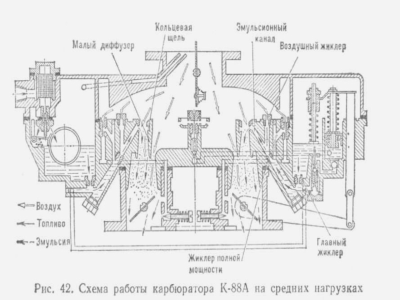 Топливо поступает из поплавковой камеры через главный жиклер к жиклеру полной мощности, а затем в эмульсионный канал, где оно тормозится воздухом, поступающим через воздушный жиклер. Часть топлива, прошедшая главный жиклер, поступает в жиклер холостого хода, где, смешиваясь с воздухом, образует эмульсию, которая по каналам через отверстия в смесительной камере попадает под дроссельные заслонки.