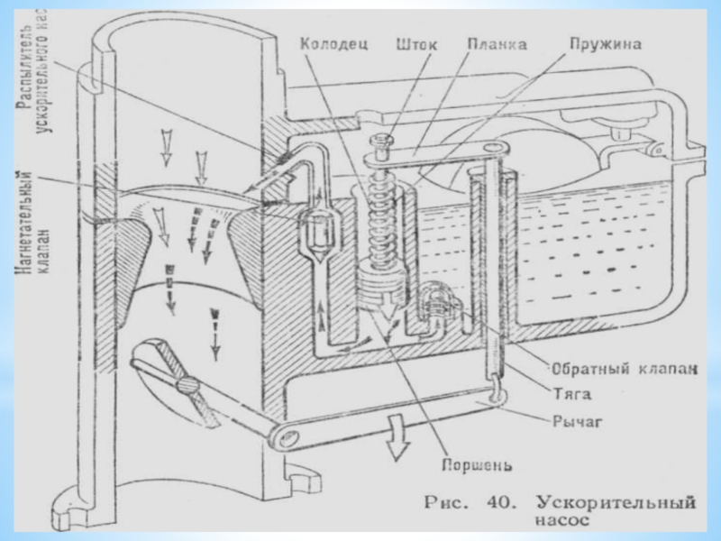 Ускорительный насос состоит из колодца, поршня с пружиной, штока, планки, тяги, рычага и двух клапанов: обратного и нагнетательного. Полость под поршнем заполнена топливом, поступающим через открытый обратный клапан.