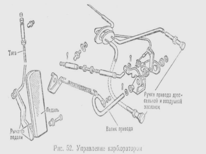 и двух ручек на панели приборов (рис. 52). Педаль и ручка управления дроссельными заслонками служат для воздействия на них. Второй ручкой управляют воздушной заслонкой. Педаль управления соединена с осью дроссельных заслонок при помощи системы тяг и рычагов, которые возвращаются в исходное положение пружиной. Одна из тяг привода имеет упругое соединение, предотвращающее поломку привода при нажатии на педаль после полного открытия дроссельных заслонок. Ручки управления дроссельными и воздушной заслонками соединены с ними гибкими тягами. Ручкой управления дроссельными заслонками можно установить и зафиксировать требуемую частоту вращения коленчатого вала, например, при прогреве двигателя. Рукояткой воздушной заслонки регулируют ее положение.