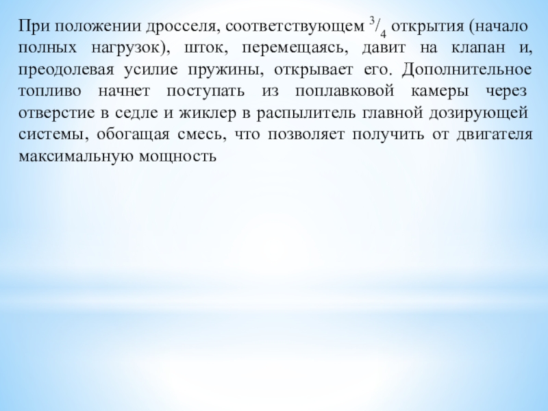 Слайд 33При положении дросселя, соответствующем 3/4 открытия (начало полных нагрузок), шток, перемещаясь,