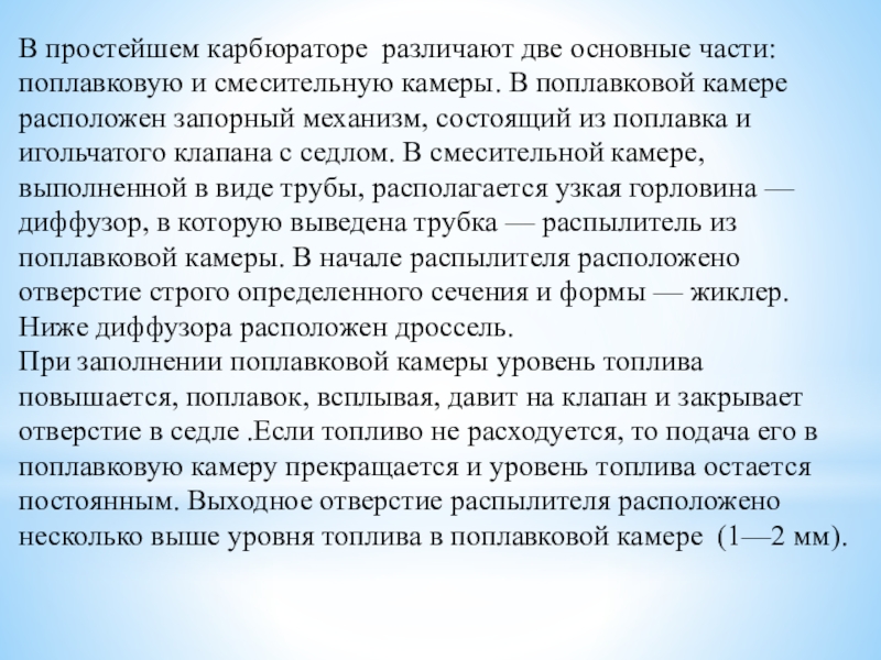 Слайд 16В простейшем карбюраторе различают две основные части: поплавковую и смесительную камеры.