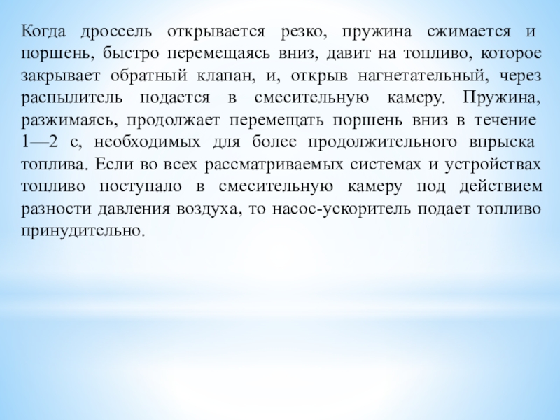 Слайд 36Когда дроссель открывается резко, пружина сжимается и поршень, быстро перемещаясь вниз,