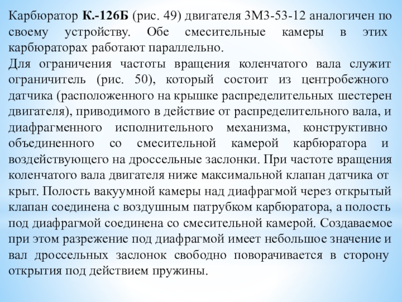 Слайд 53Карбюратор К.-126Б (рис. 49) двигателя 3M3-53-12 аналогичен по своему устройству. Обе