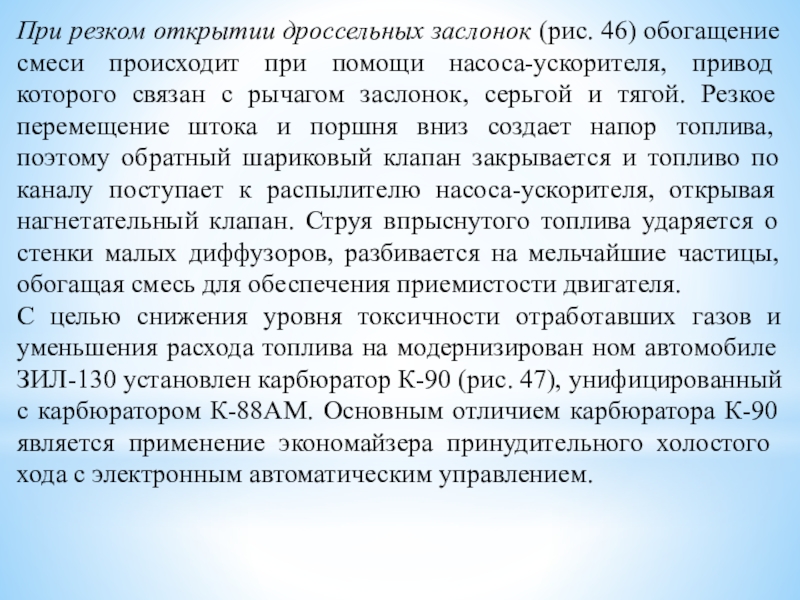 Слайд 47При резком открытии дроссельных заслонок (рис. 46) обогащение смеси происходит при