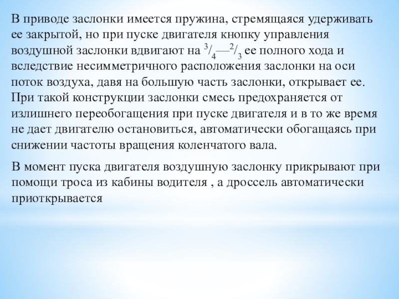 Слайд 29В приводе заслонки имеется пружина, стремящаяся удерживать ее закрытой, но при