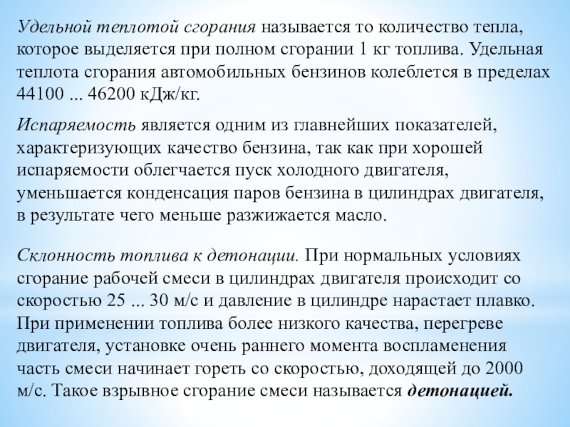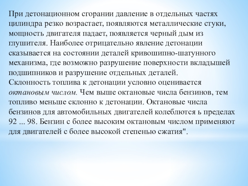 Склонность топлива к детонации. При нормальных условиях сгорание рабочей смеси в цилиндрах двигателя происходит со скоростью 25 ... 30 м/с и давление в цилиндре нарастает плавко.
