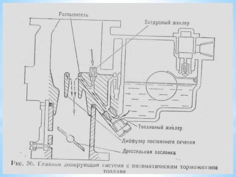 дозирующей системой. В карбюраторах применяют главную дозирующую систему с пневматическим торможением топлива , состоящую из топливного и воздушного жиклеров и диффузора постоянного сечения.