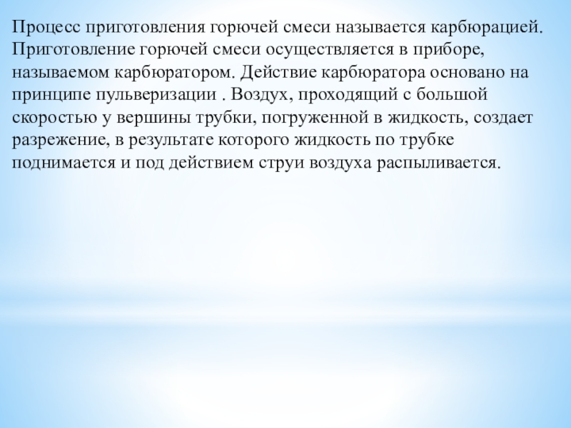 Слайд 14Процесс приготовления горючей смеси называется карбюрацией. Приготовление горючей смеси осуществляется в