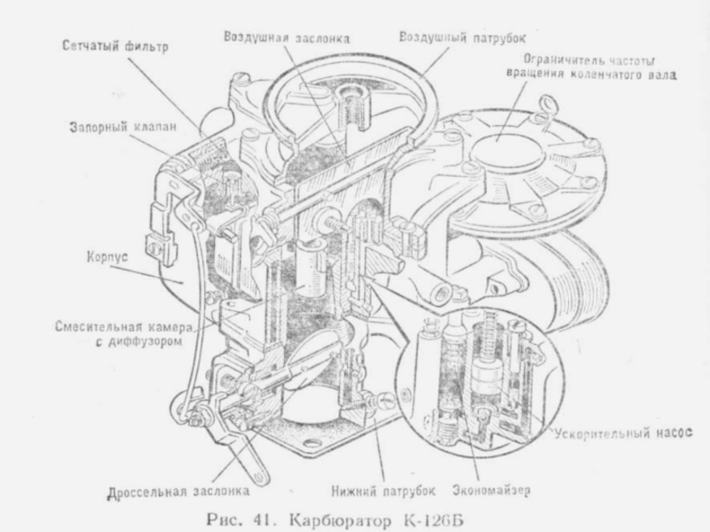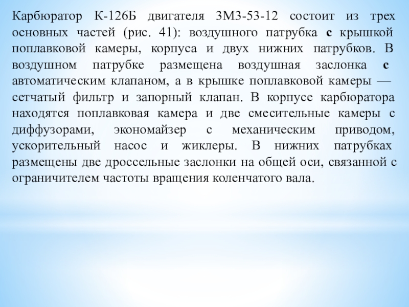 Слайд 37Карбюратор К-126Б двигателя 3M3-53-12 состоит из трех основных частей (рис. 41):
