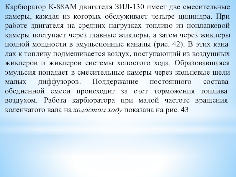 Слайд 39Карбюратор К-88АМ двигателя ЗИЛ-130 имеет две смесительные камеры, каждая из которых